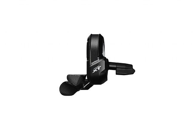 Shimano’s SW-M8050 Left Shifter has a short lever throw and tactile button-feel to provide instant and responsive shifts on XT Di2 electronic mountain groupsets, and because it’s all electronic, Shimano was able to maximize ergonomic comfort without the constraints of mechanical internals. Each lever can be adjusted in length for the perfect fit for any size hand, and XT Di2’s E-Tube customization allows for upshifting or downshifting to be assigned to either lever, as well as front / rear derailleur operation or both when used with Shimano’s 2 x 11 Synchro Shift option.
