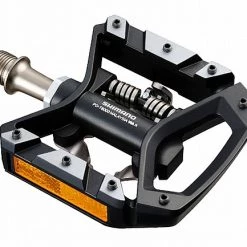 The Shimano XT PD-T8000 Touring Pedal is built on the renowned XT M8000 clipless pedal but has a platform underside for interchangeable use between flat and clipless shoes. The mud-shedding clipless mechanism provides lasting reliability, and sealed cup-and-cone bearings will keep spinning smoothly through all weather conditions. The wide alloy platform features integrated ridges for increased traction with flat-soled shoes, and a built-in reflector increases visibility in low light.